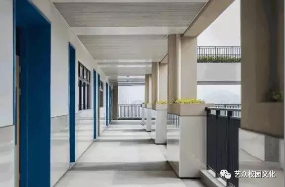 课室走道以健康绿色为理念,引入绿植,局部色彩点缀,简洁大方又环保健康。 白色的铝板天花,采用条形和平板结合,使天花整齐统一又富有变化,与地面颜色变化相呼应,避免狭长的走廊过于单调。